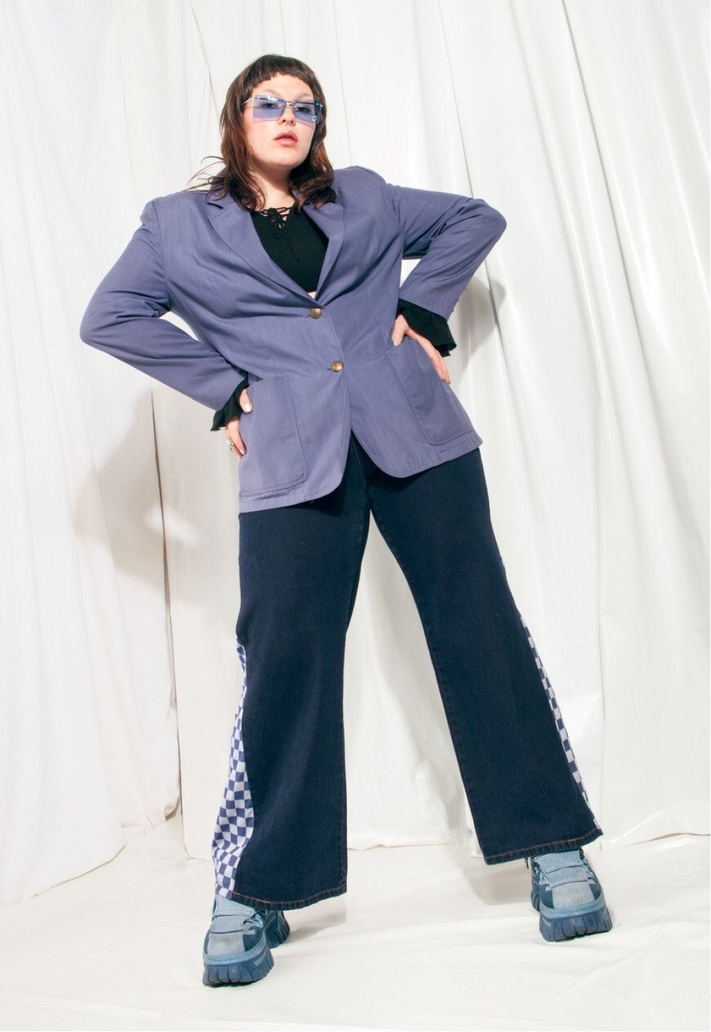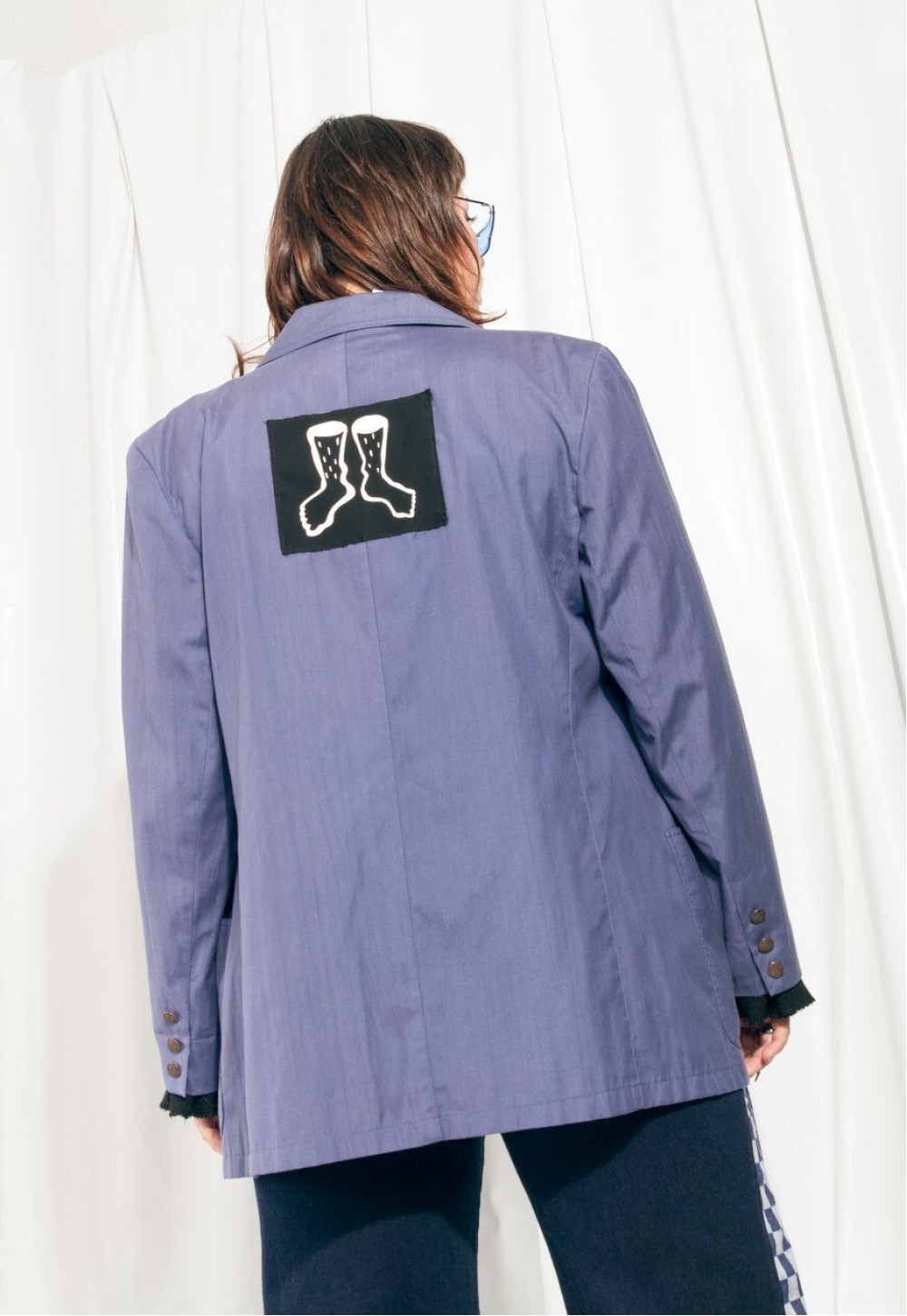 An oversized purple blazer from the early 90s that our rework team fixed with a limited edition graphic patch. It's a real vintage jacket that survived all these years in great An oversized purple blazer from the early 90s that our rework team fixed with a limited edition graphic patch. It's a real vintage jacket that survived all these years in great condition. It's a lengthened, boxy fit cut made of cotton blend fabric.Our model, Sawa is 170 cm / 66.3" tall and she's a size XXL.Labelled size: 44Fabric: cotton 50%, polyester 50%