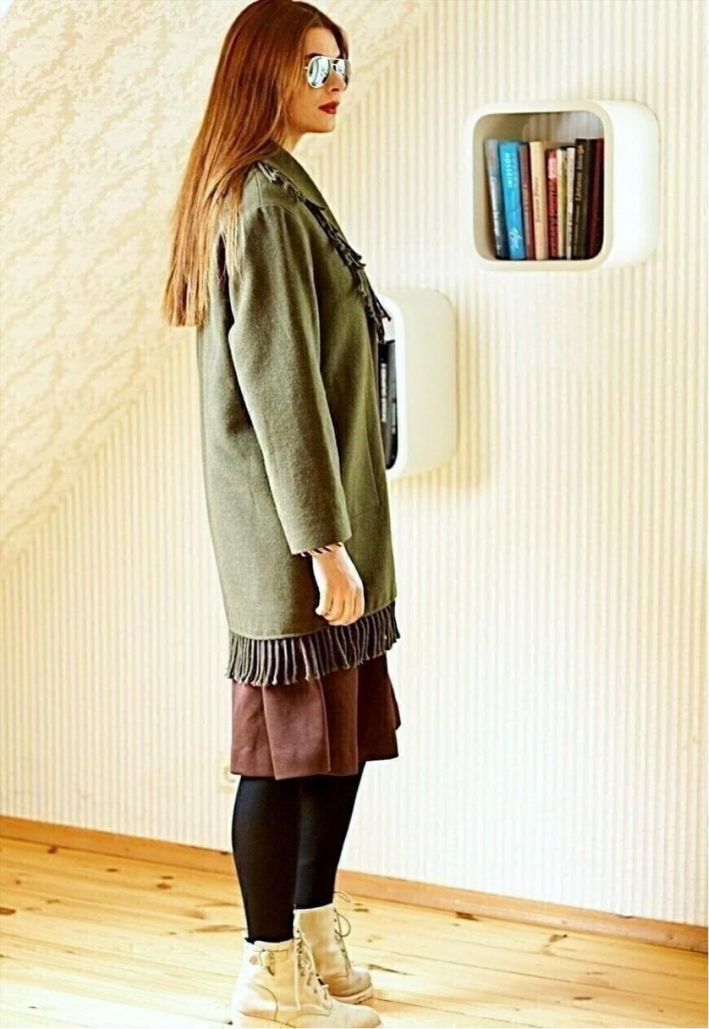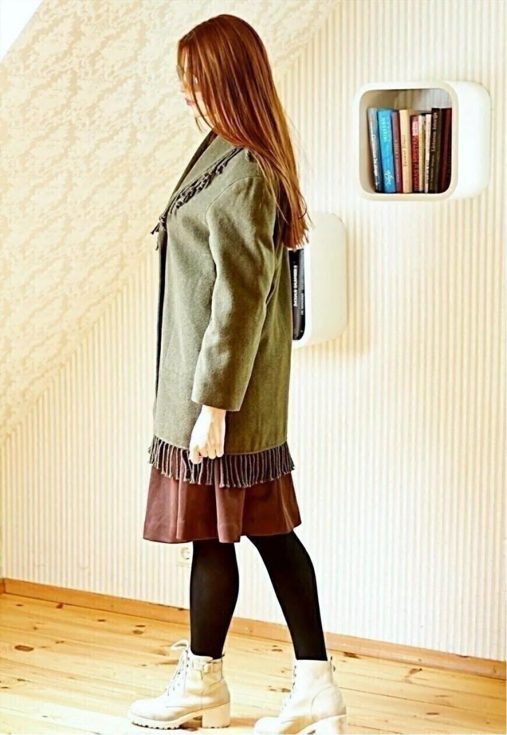 Lovely vintage khaki wool jacket with lining and tassels. Model is a UK 10 and 5"6. Length of the coat is 29.4 inches, chest 20.4 inches. Please note this is a vintage item so minor signs of Lovely vintage khaki wool jacket with lining and tassels. Model is a UK 10 and 5"6. Length of the coat is 29.4 inches, chest 20.4 inches. Please note this is a vintage item so minor signs of wear are expected.