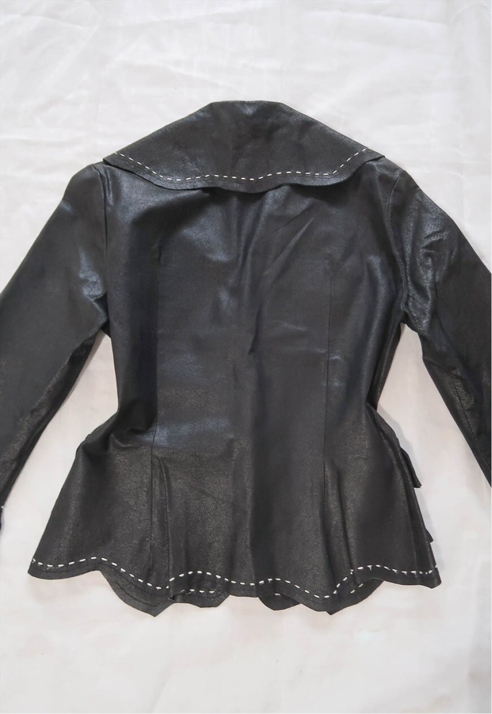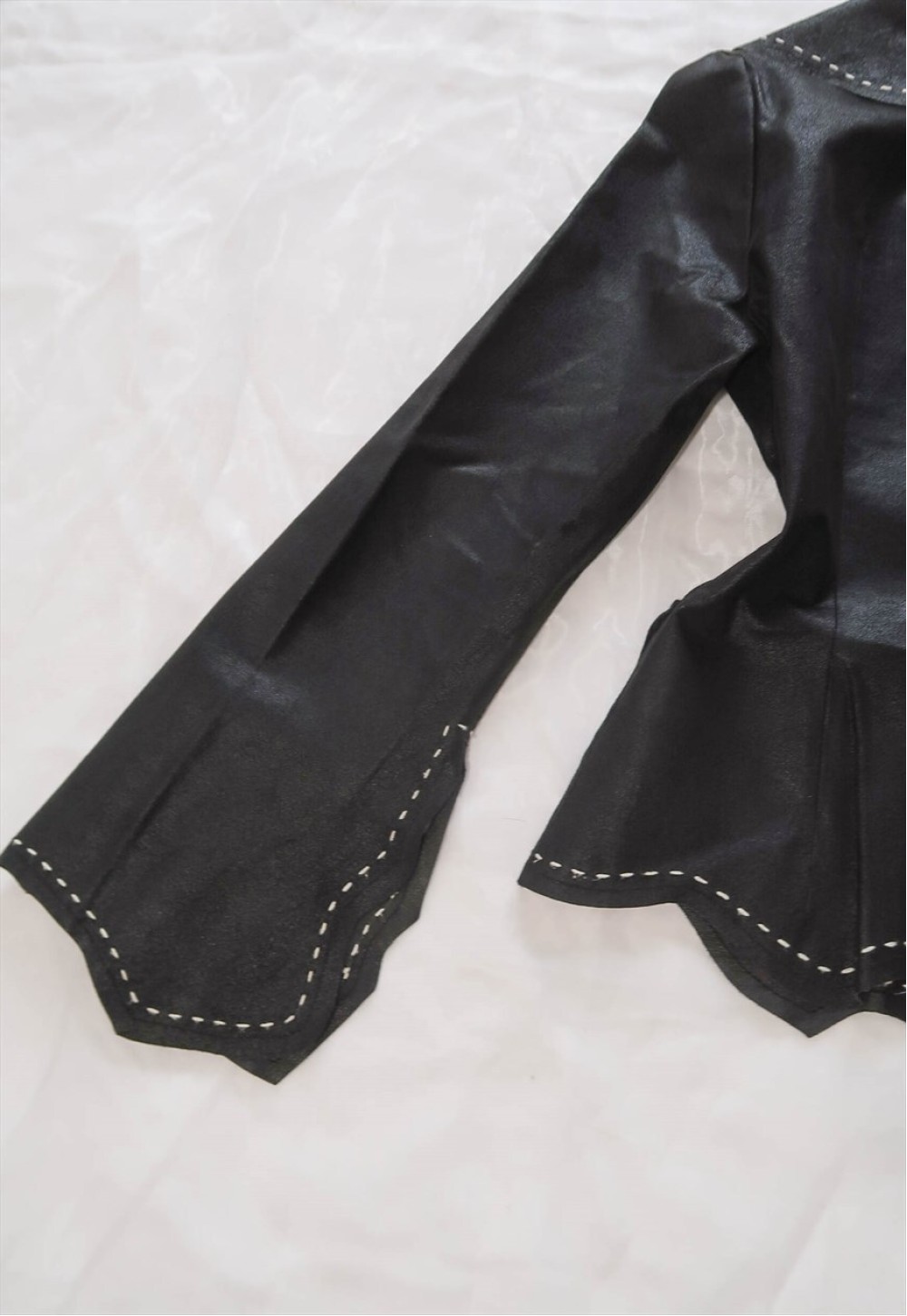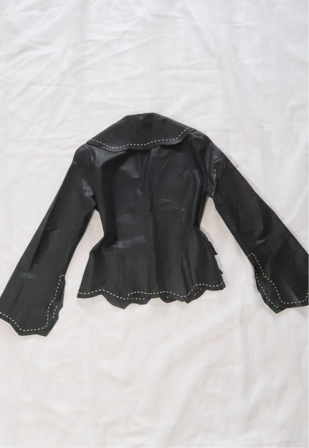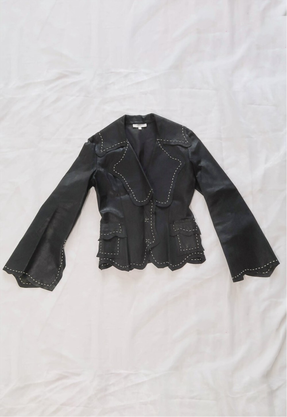 This incredible blazer comes in a genuine leather construction, white contrasted stitching details, long flared sleeves with split, v special wavy cut.French designer. Label size 2, fits This incredible blazer comes in a genuine leather construction, white contrasted stitching details, long flared sleeves with split, v special wavy cut.French designer. Label size 2, fits like M. Excellent vintage cond.in cm : pit to pit 45, length 54, shoulder 40, sleeve 60