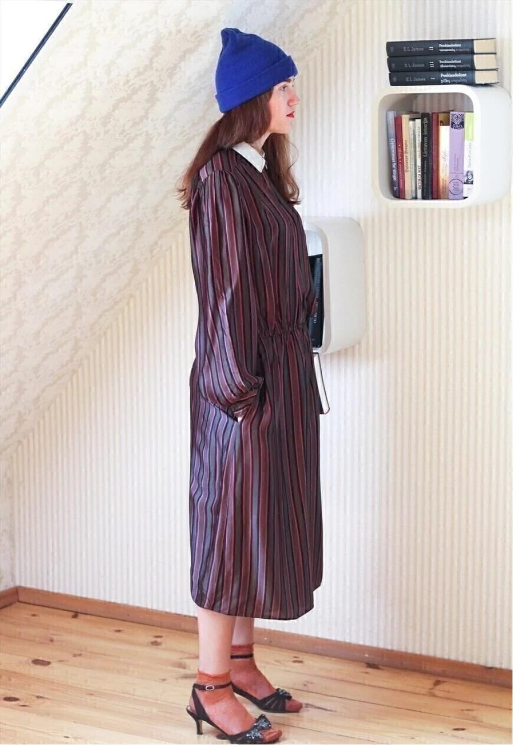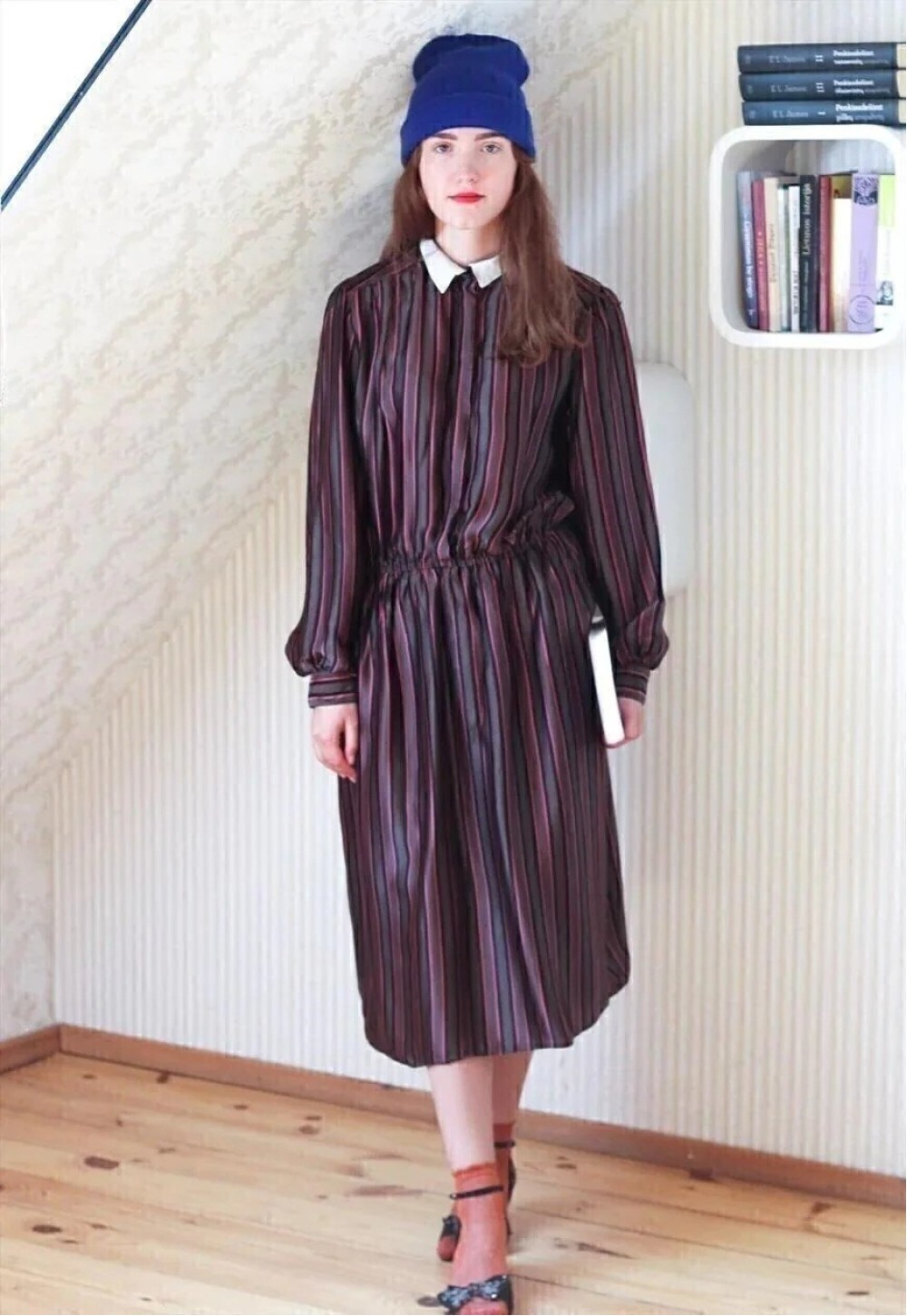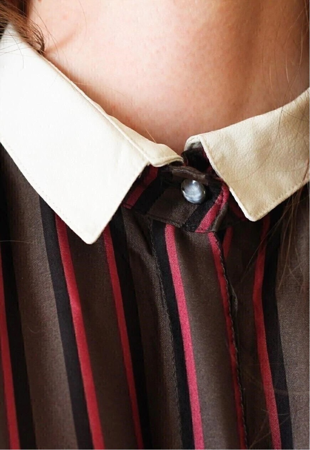 Lovely khaki brown and pink striped long sleeve light silky vintage dress with detachable white collar and side pockets. The size on the label is 42. Model is a UK 6 and 5"4. Length of the Lovely khaki brown and pink striped long sleeve light silky vintage dress with detachable white collar and side pockets. The size on the label is 42. Model is a UK 6 and 5"4. Length of the dress is 47 inches, chest 22 inches, has an elasticated waist. Please note this is a vintage item so minor signs of wear are expected.