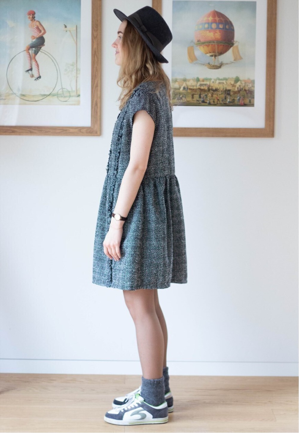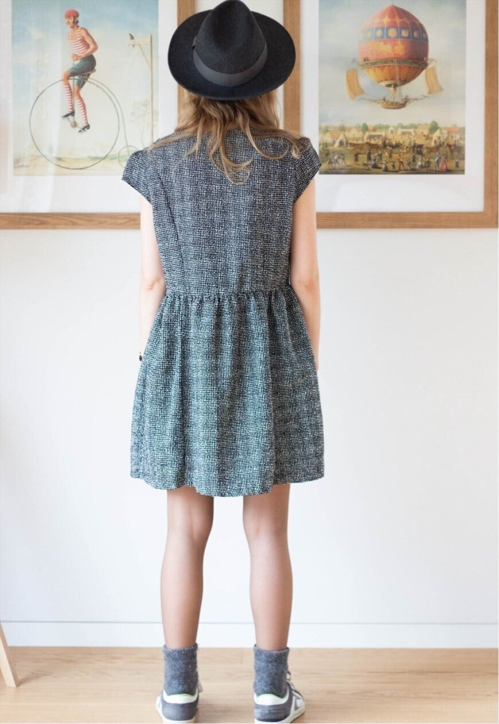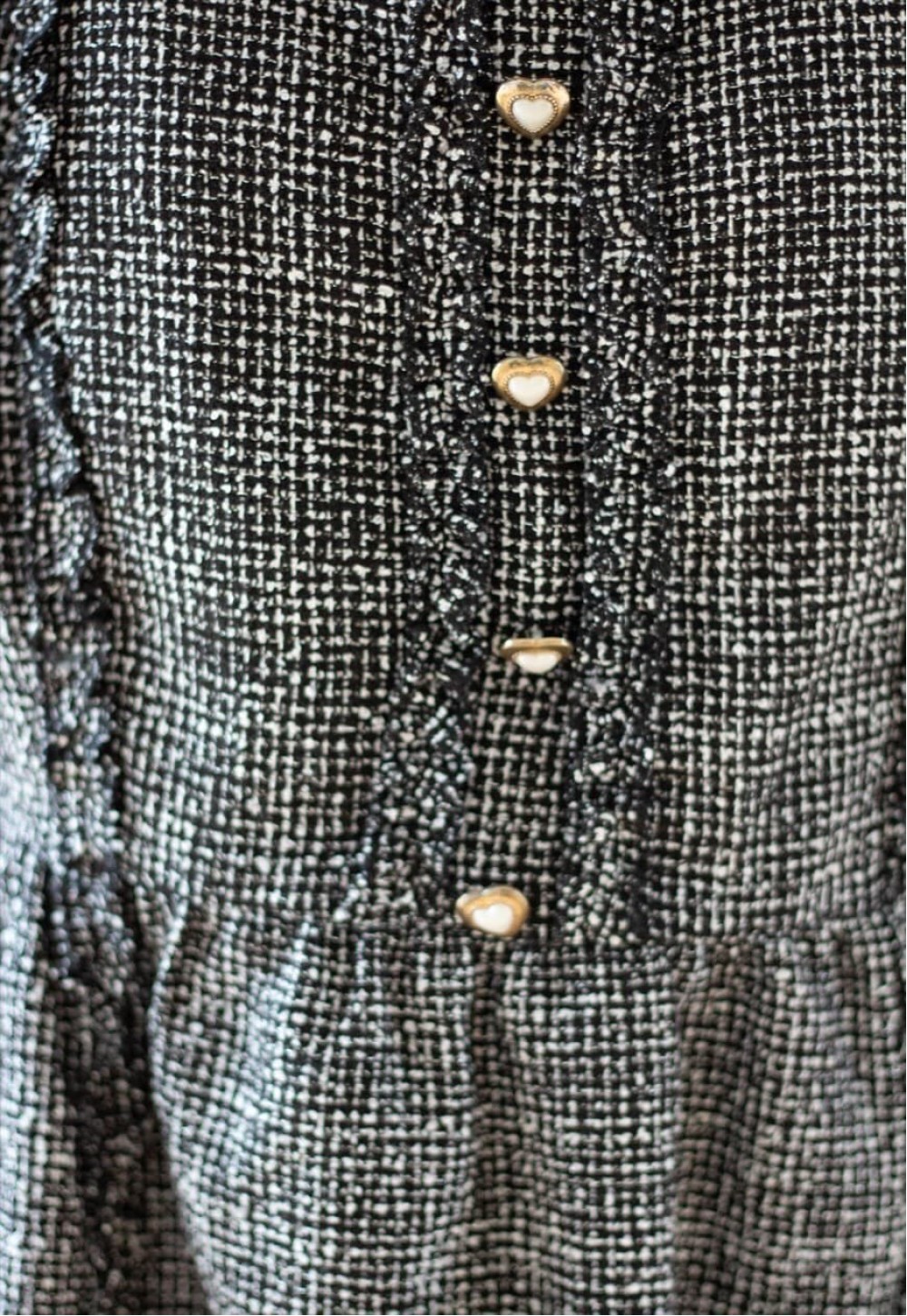 Lovely black and white woven short sleeve dress with heart shape buttons at the front. The size on the label is 16. Model is a UK 6 and 5"4. Length of the dress is 34 inches, chest 20 Lovely black and white woven short sleeve dress with heart shape buttons at the front. The size on the label is 16. Model is a UK 6 and 5"4. Length of the dress is 34 inches, chest 20 inches, waist is 17 inches, has a zip on the side. Please note this is a vintage item so minor signs of wear are expected.