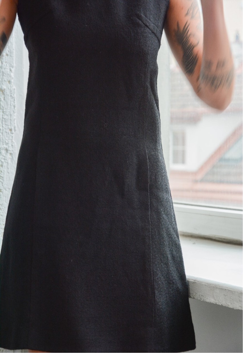 Vintage classic mini black wool zip fastening on the back dress with pockets on the front and thin inner lining. UK size not written but looks flexible like 8-10. Model size on the photo is Vintage classic mini black wool zip fastening on the back dress with pockets on the front and thin inner lining. UK size not written but looks flexible like 8-10. Model size on the photo is 6-8. Measurements: length 35.4 inches, chest 33.8 inches, waist 31.5 inches, hips 39.4 inches.