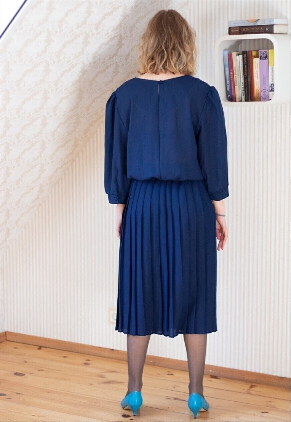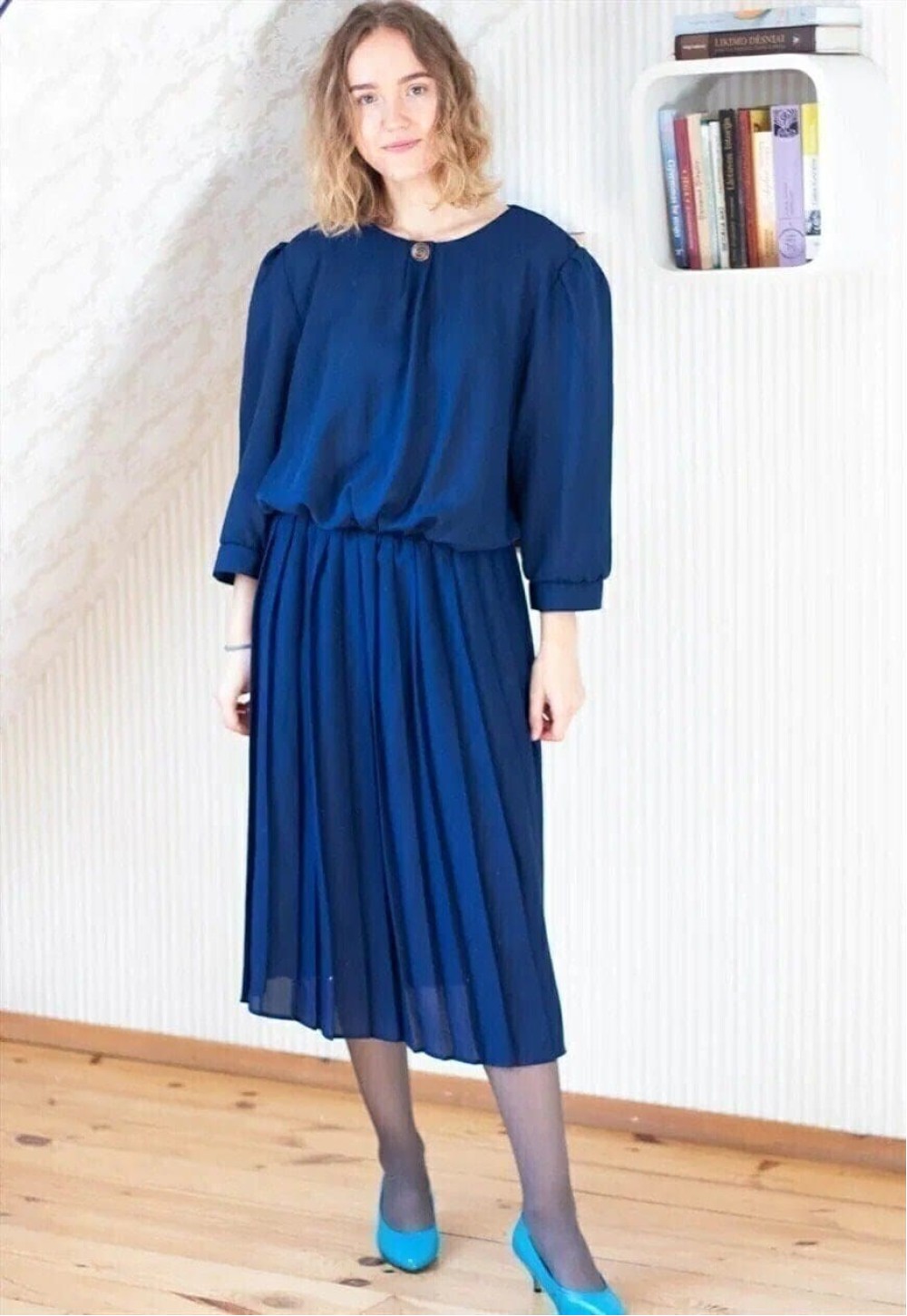 Lovely dark blue long sleeve round collar vintage dress with gold button and pleated skirt. The size on the label is 16. Model is a UK 6 and 5"4. Length of the dress is 47 inches, chest 23 Lovely dark blue long sleeve round collar vintage dress with gold button and pleated skirt. The size on the label is 16. Model is a UK 6 and 5"4. Length of the dress is 47 inches, chest 23 inches, has an elasticated waistband. Please note this is a vintage item so minor signs of wear are expected.