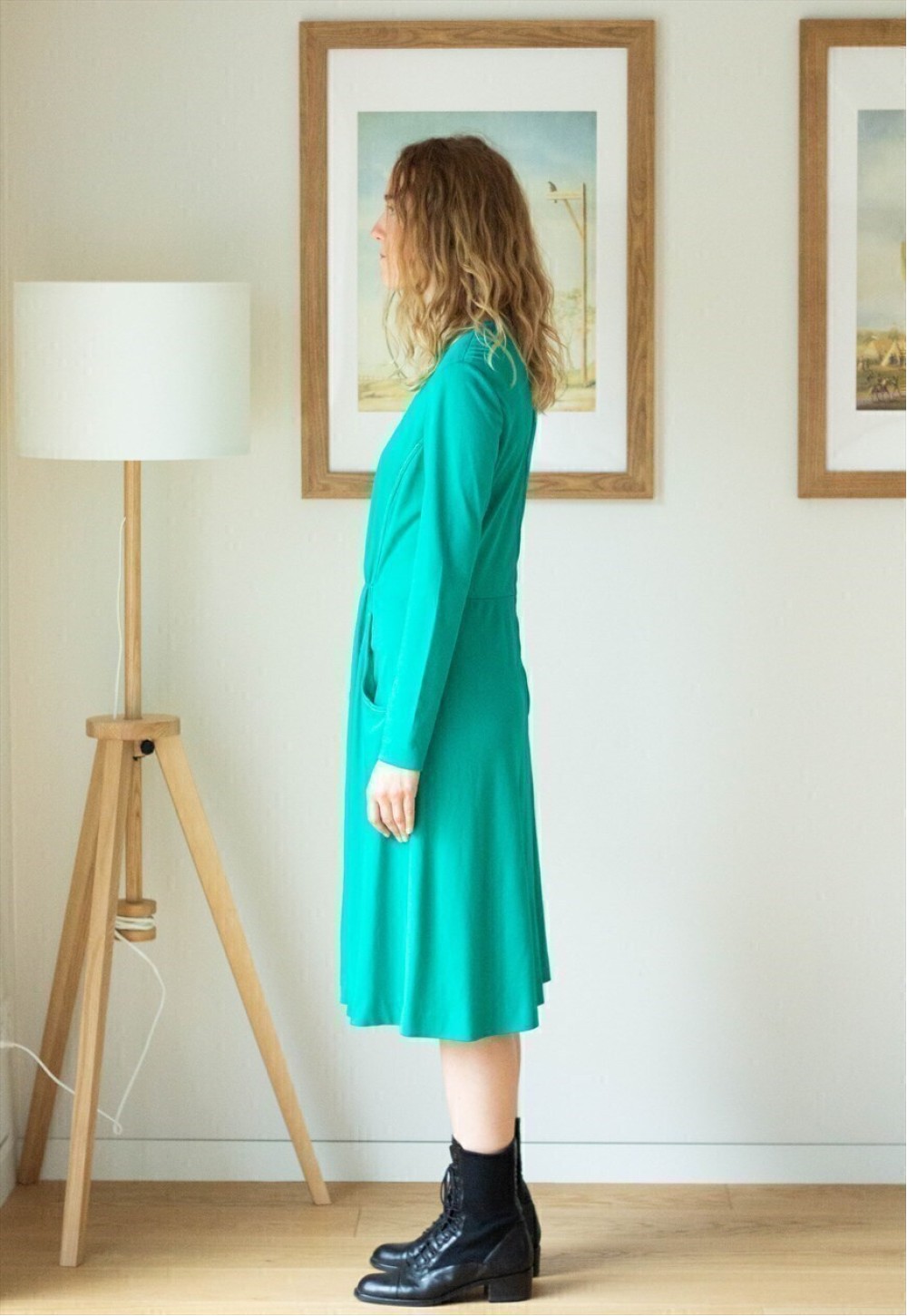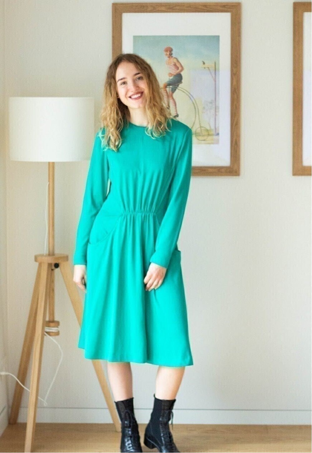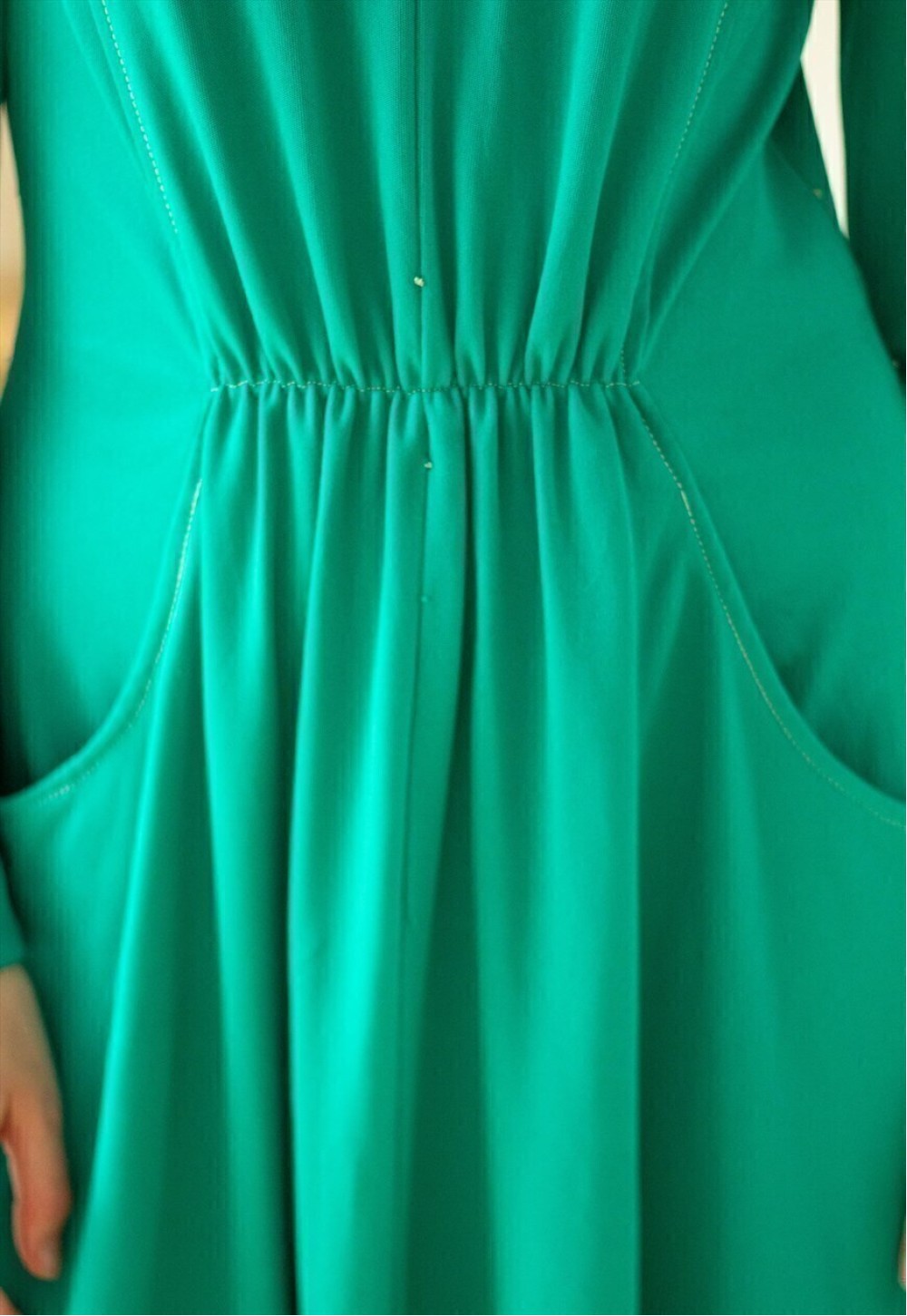 Lovely green long sleeve elasticated waist midi vintage dress with pockets. There is no size on the label. Model is a UK 6 and 5"4. Length of the dress is 41 inch, chest 18 inches, waist is Lovely green long sleeve elasticated waist midi vintage dress with pockets. There is no size on the label. Model is a UK 6 and 5"4. Length of the dress is 41 inch, chest 18 inches, waist is 17 inches, has a zip at the back. Please note this is a vintage item so minor signs of wear are expected.