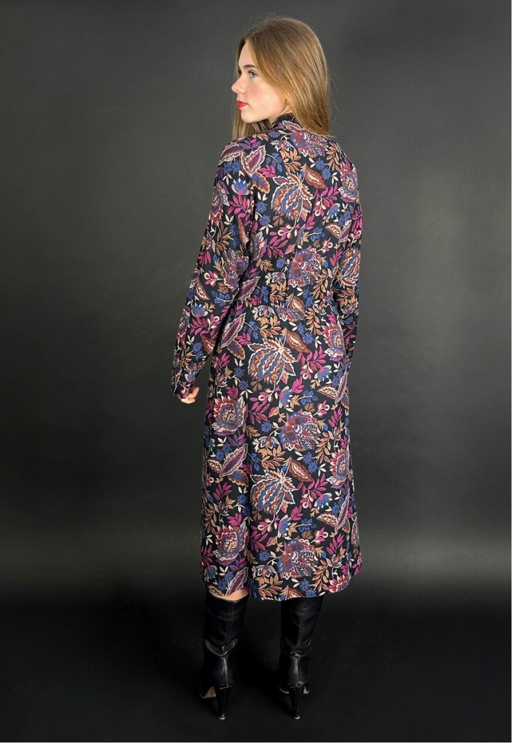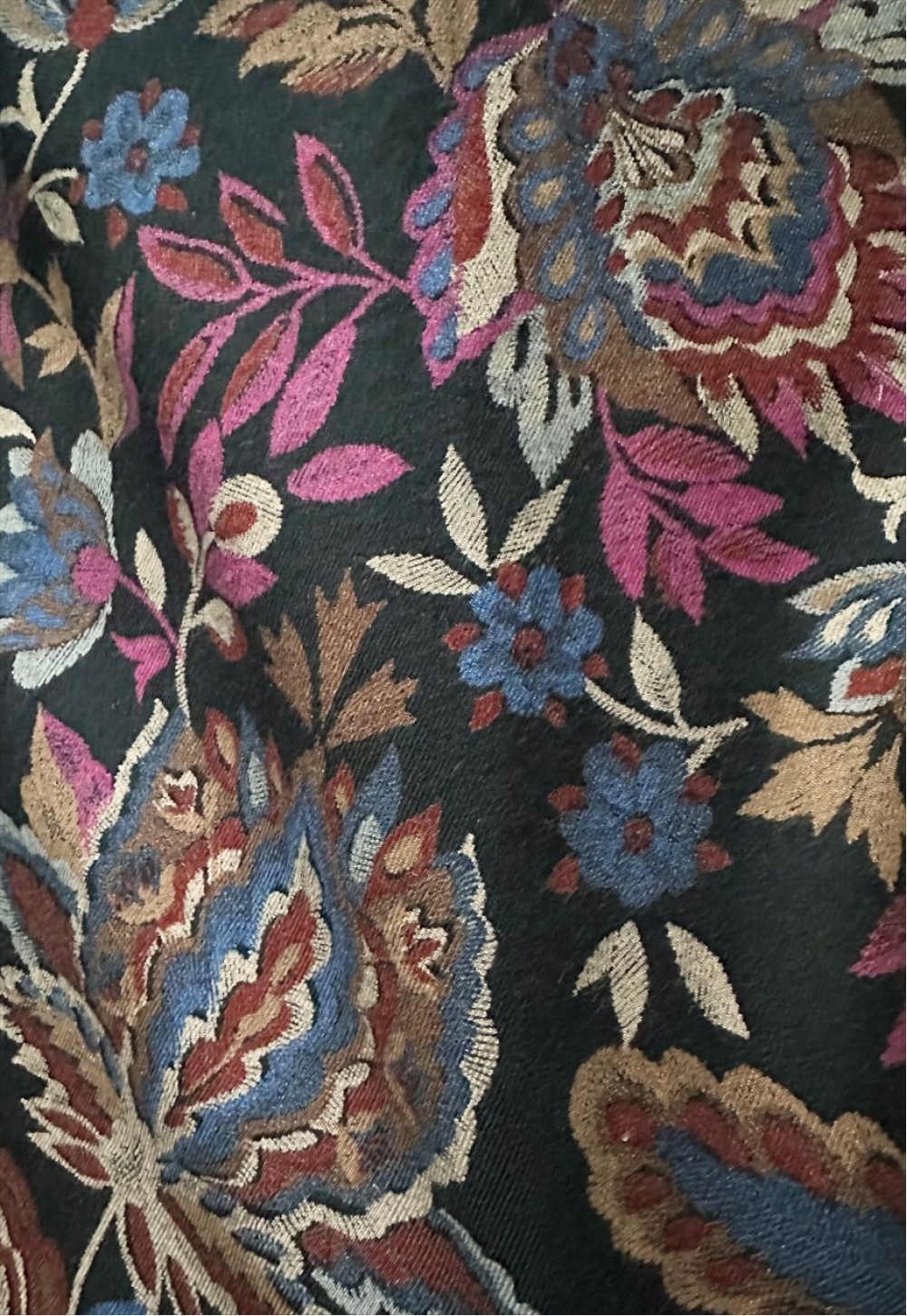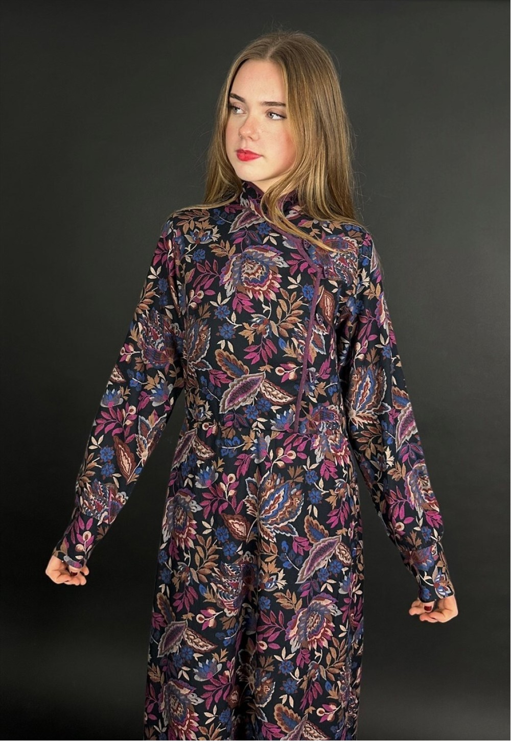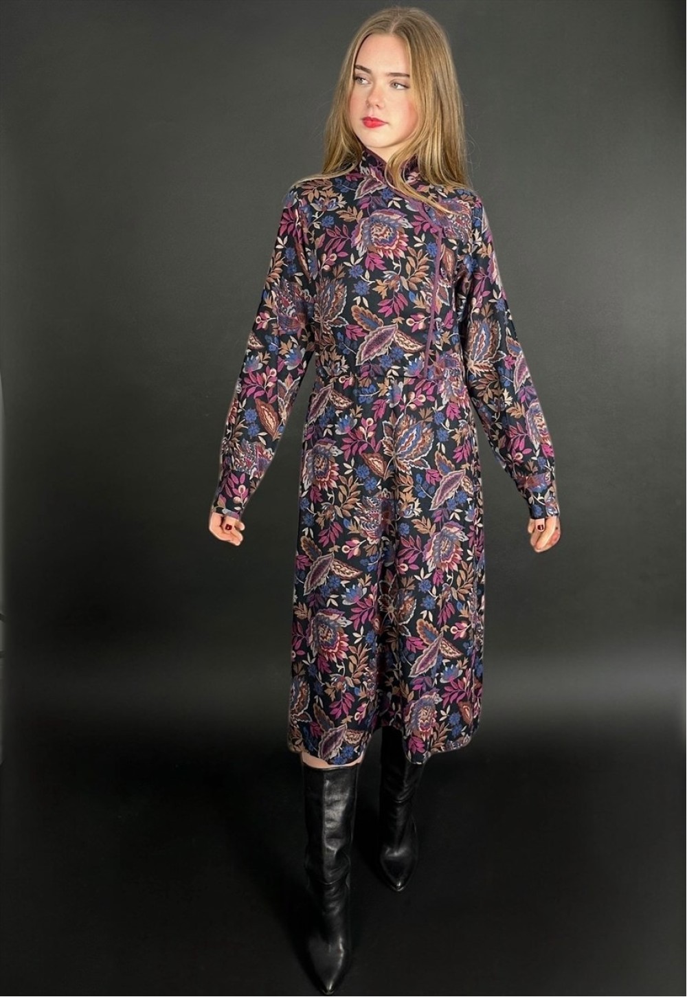 70's Vintage Black Purple Floral Long Sleeve Midi Dress