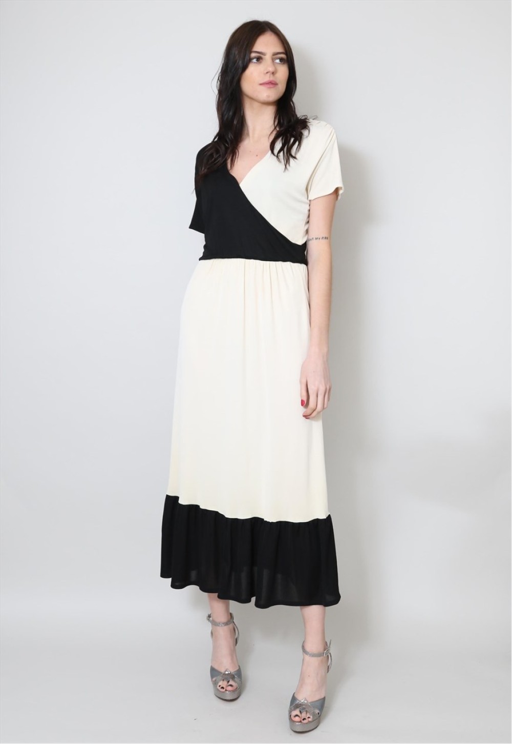 1970's Black and off white crossover midi dress made from a slinky comfortable material. Features a stretchy waistband.Dress pulls on over the head. Prairie style tiered hem.Good vintage 1970's Black and off white crossover midi dress made from a slinky comfortable material. Features a stretchy waistband.Dress pulls on over the head. Prairie style tiered hem.Good vintage condition, light general wear. Slightly batwing sleeves.You are investing in a original 1970's item so buying a sustainable vintage piece that will never date.Generous elasticated waist so would fit a small to medium.Measurements:Bust 32"Waist 22-26" (stretches)Length from waist 32"