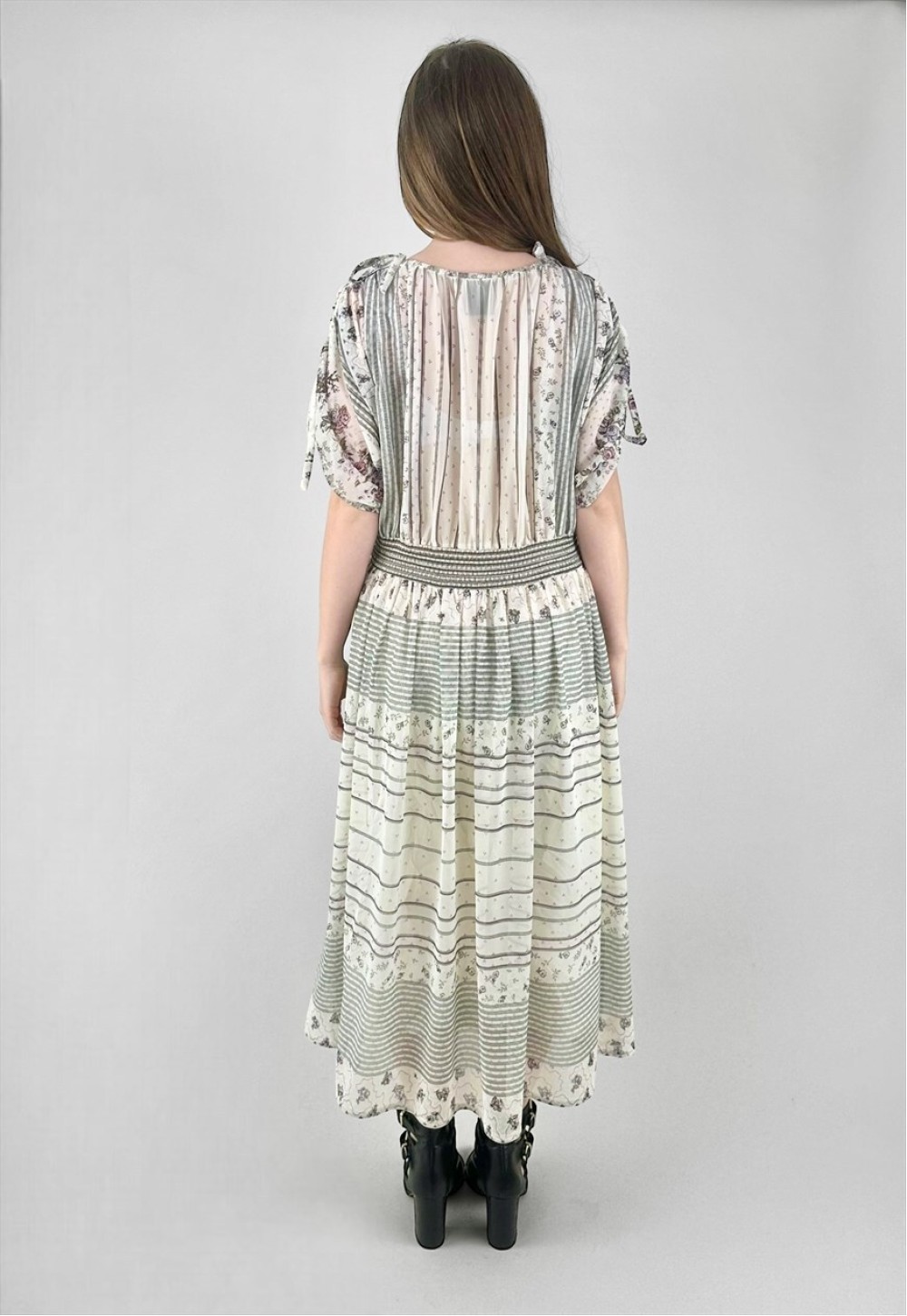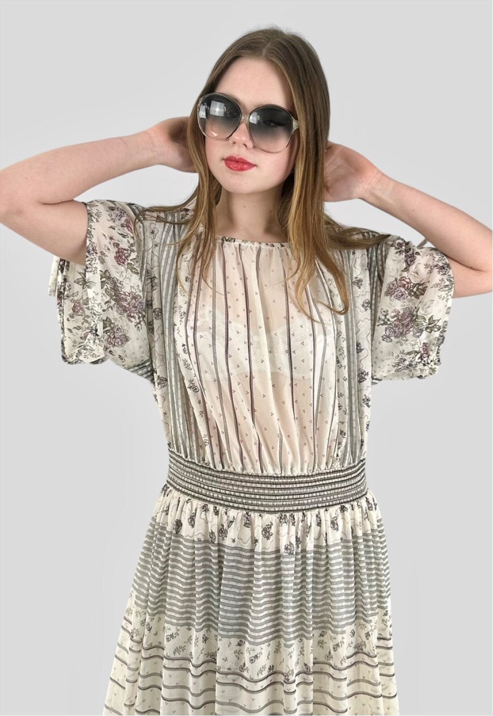 70's Vintage Cream Sheer Floral Open Sleeve Midi Dress
