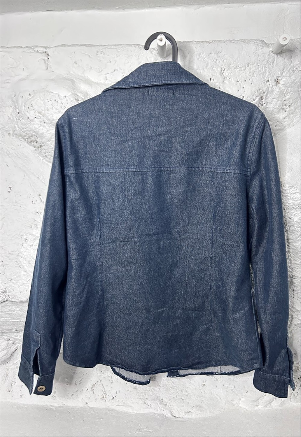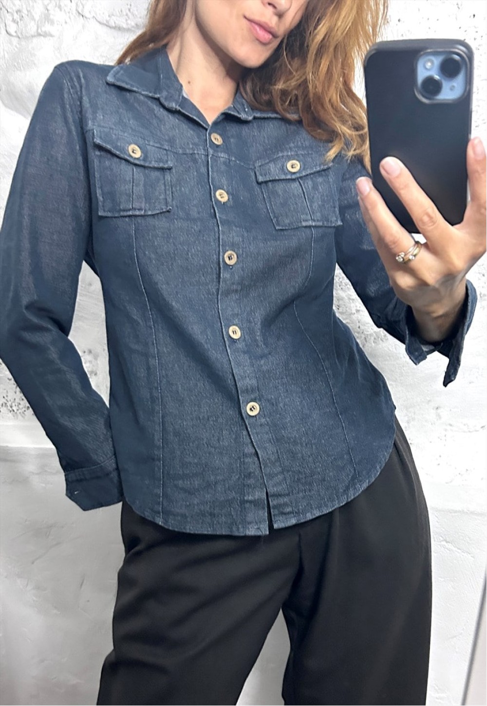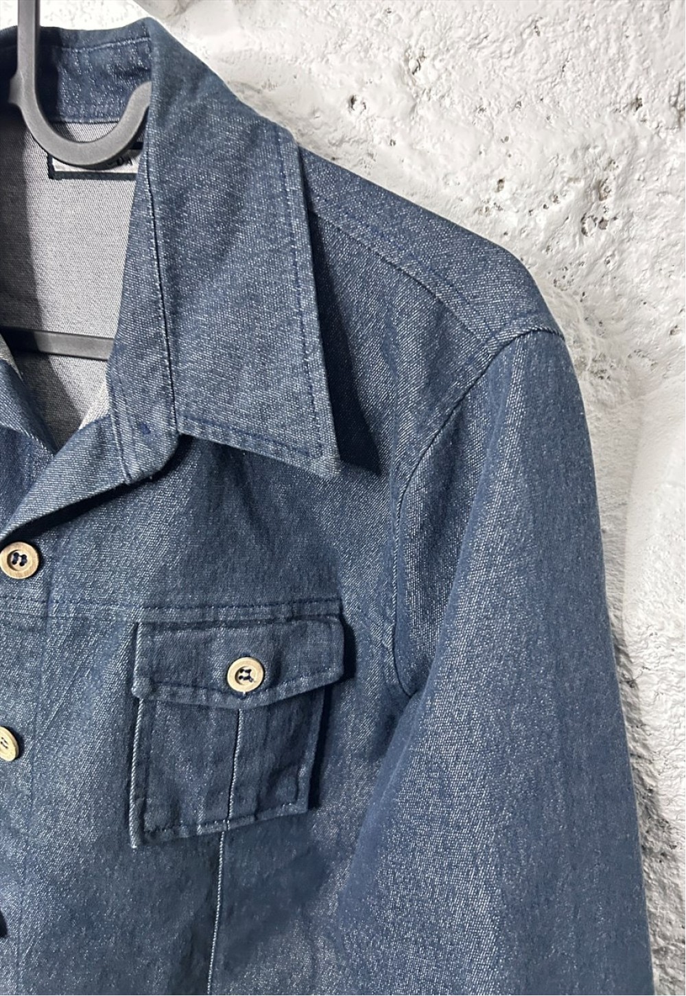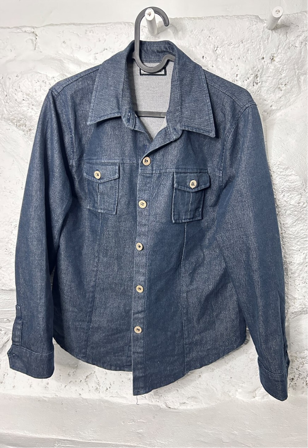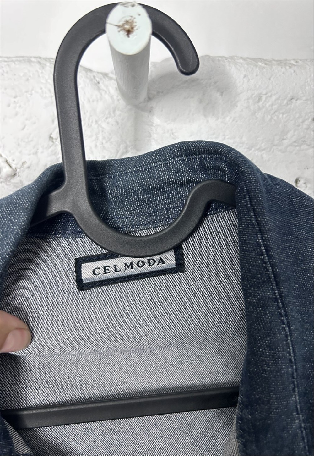 It's a Vintage 70s indigo blue button up slim jacket.With patch pockets.Elastic fabric.Button up.Slim fit.400 gr.Brand: CELMODA.Size: Labelled XL, but fits more for M or It's a Vintage 70s indigo blue button up slim jacket.With patch pockets.Elastic fabric.Button up.Slim fit.400 gr.Brand: CELMODA.Size: Labelled XL, but fits more for M or L.Material: Polyester blend.Great vintage condition.Model's height: 5'8 / 178 cm / Size S.MEASUREMENTS:Shoulders: 15 inch / 39 cm.Sleeve: 23 inch / 58 cm.Bust doubled: 39 inch / 100 cm.Waist doubled: 35 inch / 90 cm.Length: 25 inch / 63 cm.Worldwide shipping.
