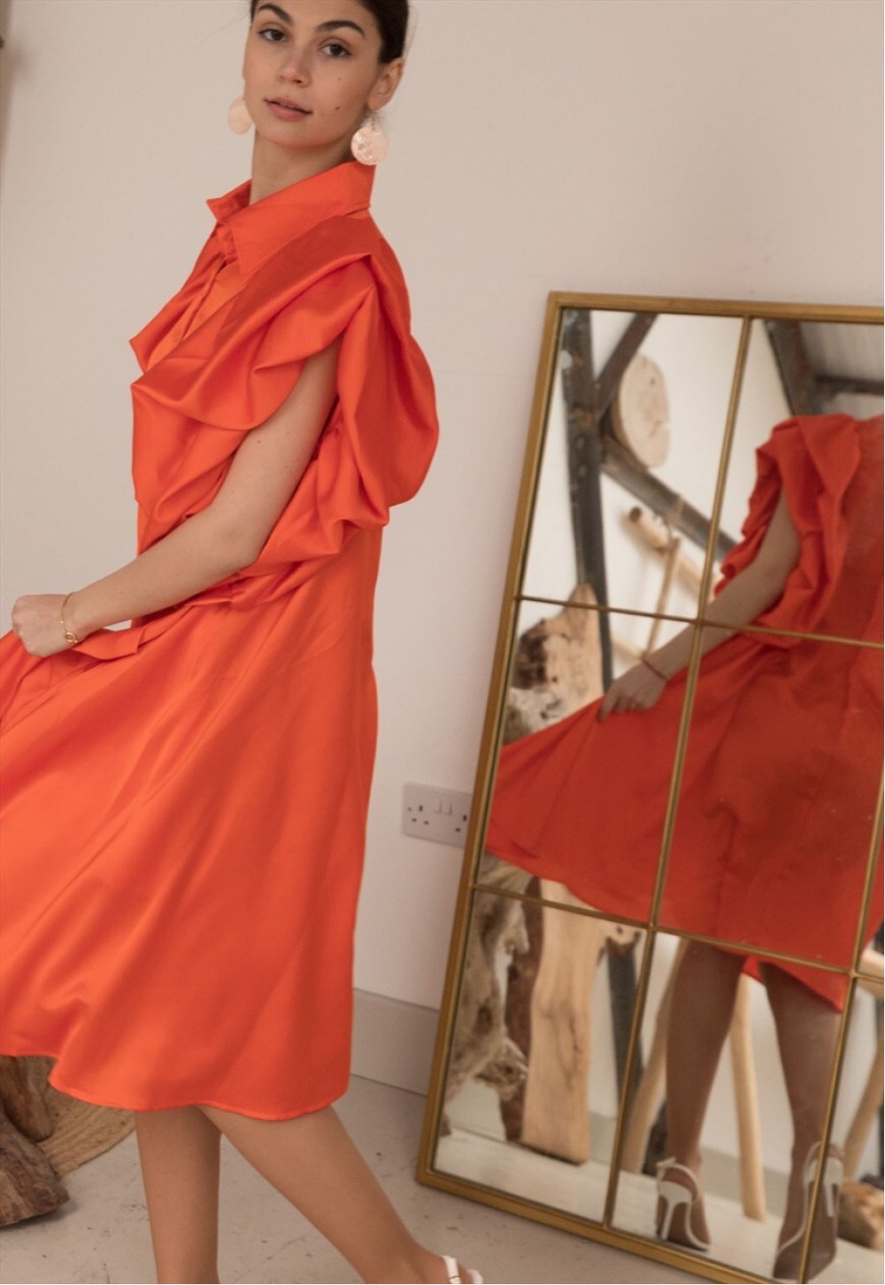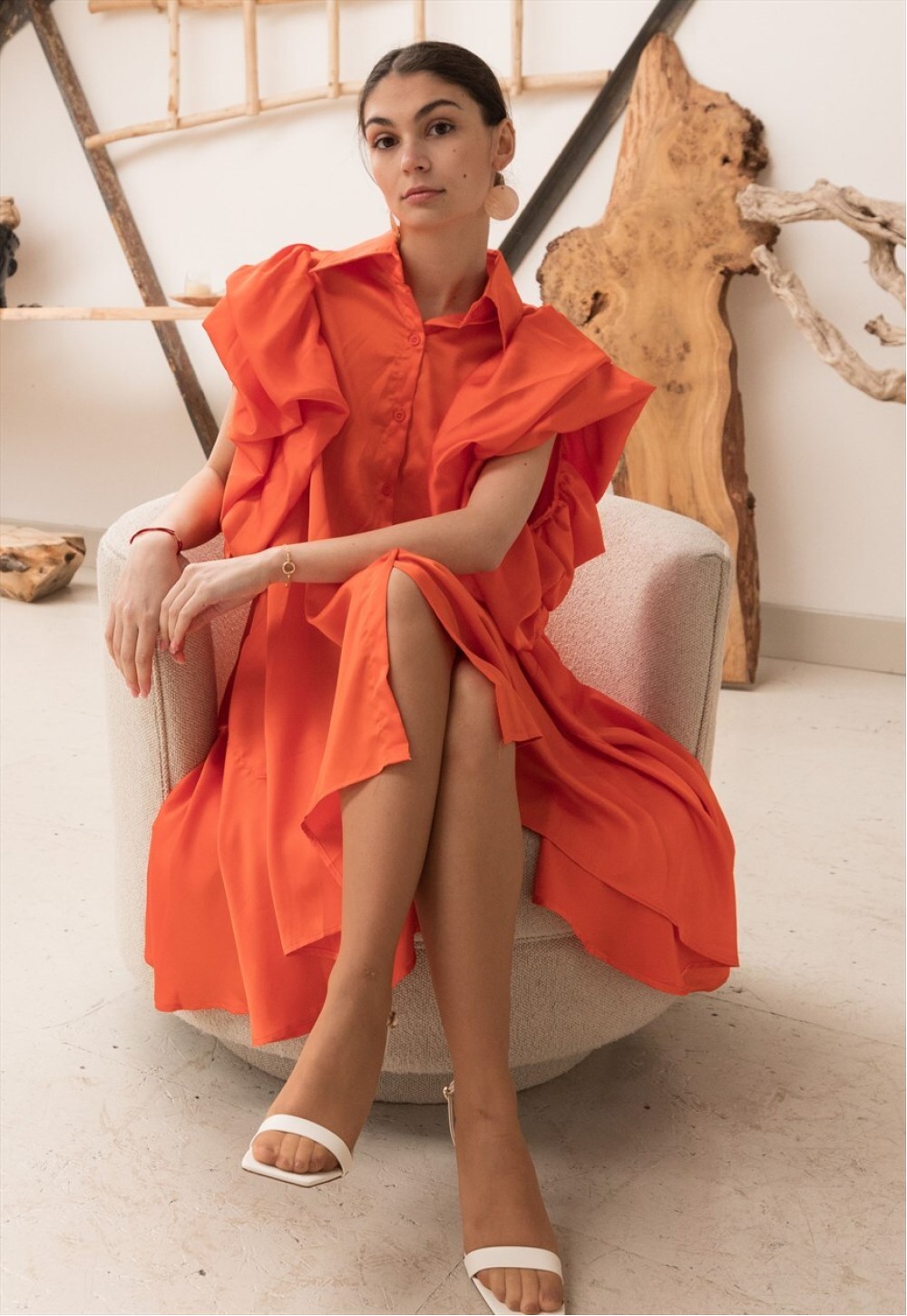 Features- Oversized Shirt Dress- Double layer Ruffle sleeves design- Silky Stain fabric- Two front pockets design- All buttons fasten in front- Orange colorSize Specification- ONE Features- Oversized Shirt Dress- Double layer Ruffle sleeves design- Silky Stain fabric- Two front pockets design- All buttons fasten in front- Orange colorSize Specification- ONE SIZE fit UK SIZE 8 to 20